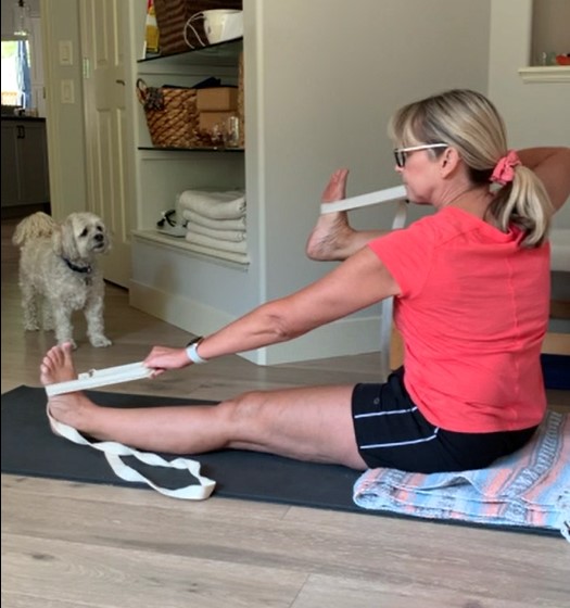 Use two looped belts as a modification if the hips and back are stiff.  Increase your mobility by drawing the foot up and back then down again, repeating several times to lubricate the hip joints.